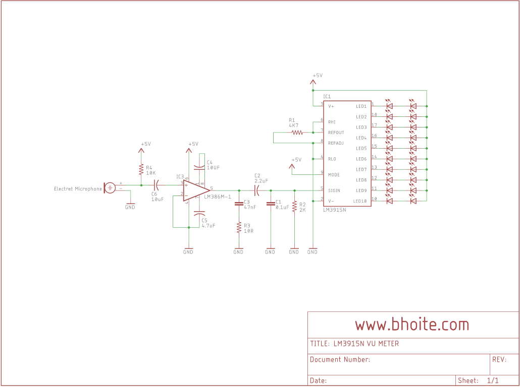Работает второй светодиод ? Если работает – проверить на всякий случай делитель из 10 резисторов – на нем должно быть напряжение от 12 вольт на R13 и до 0 вольт. Правильно 12, 6.2 5.9 5.2 4.4 3.7 2.9 и.т.д. до 0.7 на первом резисторе R22. Это и есть основной элемент для измерения напряжения сигнала. Каждый выход компаратора переключается, как только напряжение входного сигнала превысит это измерительное. ( его еже называют опорное напряжение или сравниваемое – смотря какая схема ).