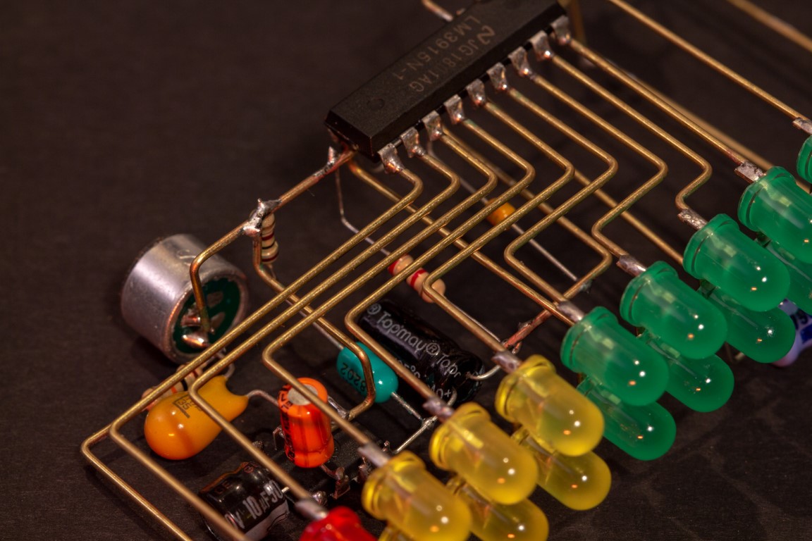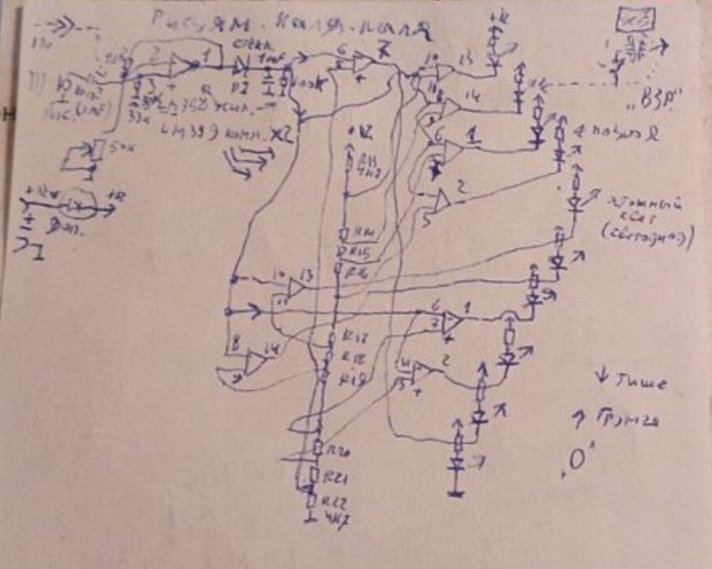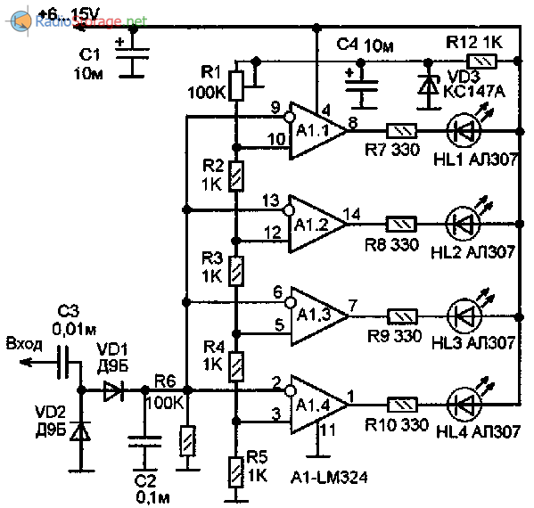 Если не работает – проверить еще раз монтаж и прозвонить компоненты. Удобно поставить щуп тестера на ноль – общий провод, и проверять все точки по отношению к нулевому проводу. И точно так же можно – с шиной питания. Правильнее – шину питания проверить перед первым включением, прозвонить все ножки микросхем, не соединяются ли они с питанием. Нужно – что бы + 12 вольт приходило только на 8 вывод усилителя, и на вывод 3 у компараторов. И на резисторы 300 ом у светодиодов, на R 13 по схеме, и больше никуда не замыкало. Так же проверить и земляную шину.