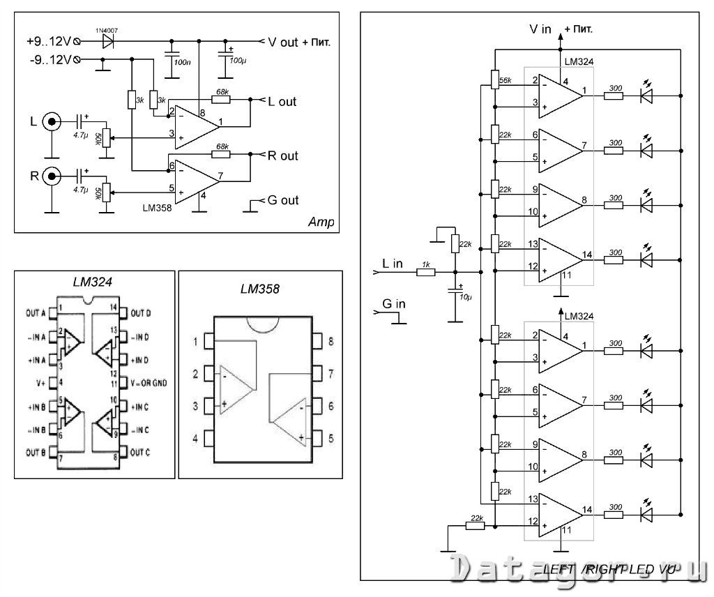 эта схема – на два канала, усилитель стерео. Она почти не отличается, только вторая микросхема тоже усилитель и всего на 4 уровня а не 9.