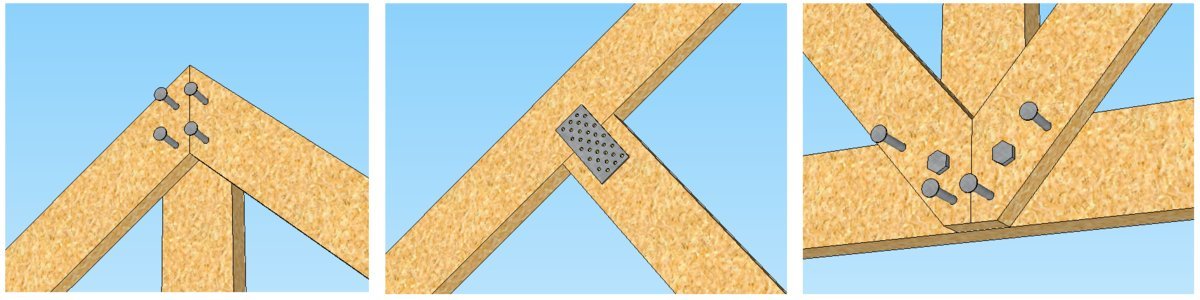 В узлах крепления используются болты, глухари, гвоздевые пластины и гвозди, по возможности нужно обойтись без саморезов или использовать их как временный крепеж перед жесткой фиксацией.