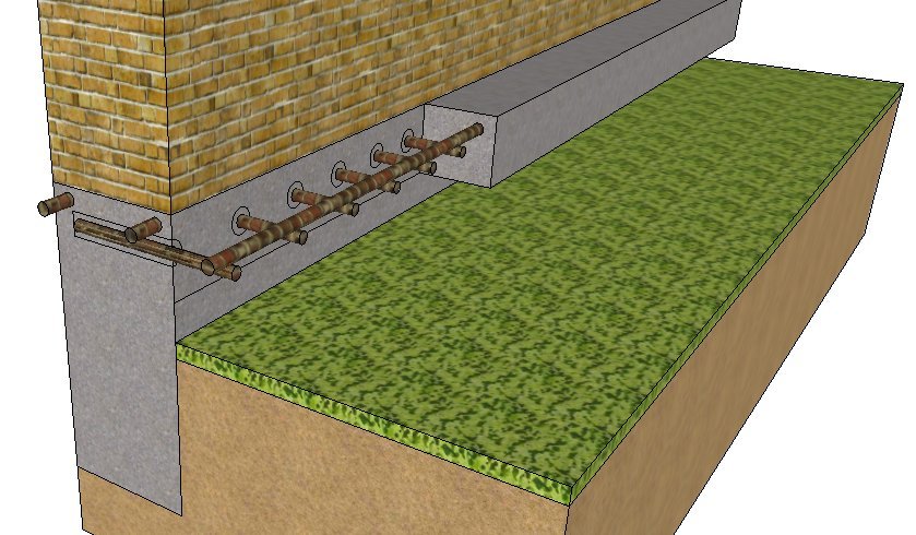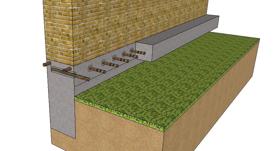 1. Классический вариант: делается дополнительный новый ленточный фундамент с примыканием к старому фундаменту, который в дальнейшем послужит в качестве опоры для кладки кирпича.