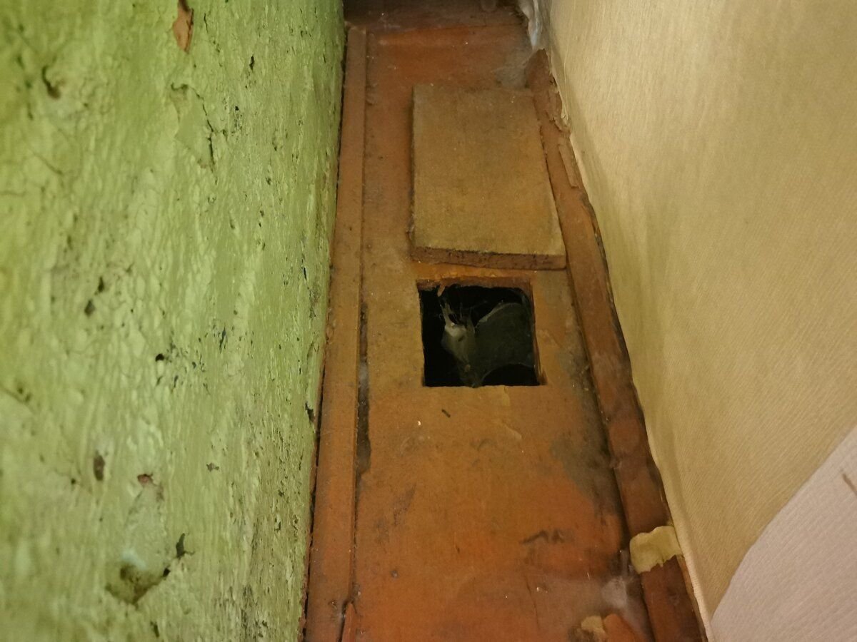 Возле печи отверстие довольно большое, через него в подпол может спокойно пролезть кошка. Мы даже думали, что это такой специальный кошачий лаз, ловить мышей. Но всё оказалось куда сложнее.