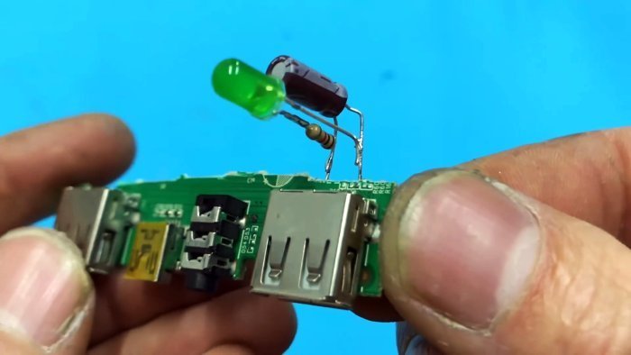 Теперь нам понадобятся несколько радиодеталей. В первую очередь разъём USB. Его мы вырежем ножницами со старой нерабочей платы. У нас на ней даже два гнезда. Очень хорошо. Чтобы случайно не перепутать, отмечаем на ножках плюс и минус питания. Кроме этого, возьмём светодиод и ограничительный резистор, чтобы контролировать выработку тока. Как только ток, необходимый для зарядки появится на контактах USB гнезда, сразу загорится светодиод. И еще поставим сглаживающий электролитический конденсатор. Номиналы деталей можно легко рассмотреть на фото.