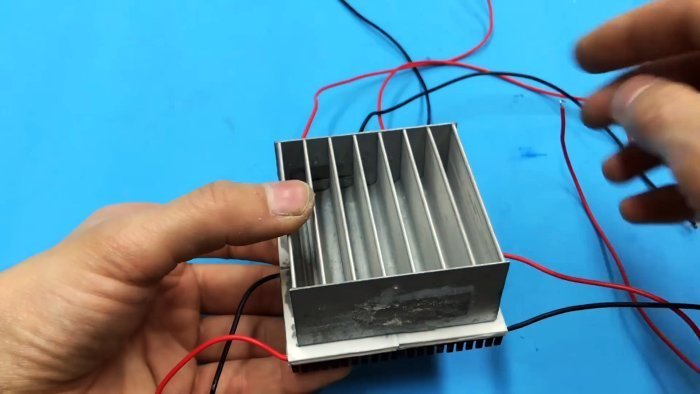 Элементы Пельтье чаще всего имеют форму плоского прямоугольника с двумя выводами. Для нашего зарядного устройства мы возьмём 4 модуля. Разместим их на радиаторе подходящего размера. На нём охлаждающие рёбра расположены таким образом, что в них можно налить воду, и она не выльется.