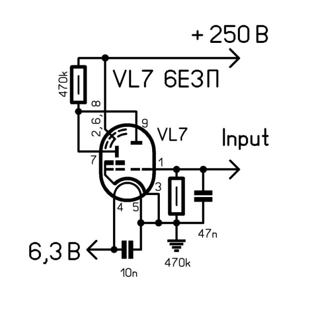 Анод – 180-230 вольтНакал – вместо штатных 6.3, лучше 6 вольт.