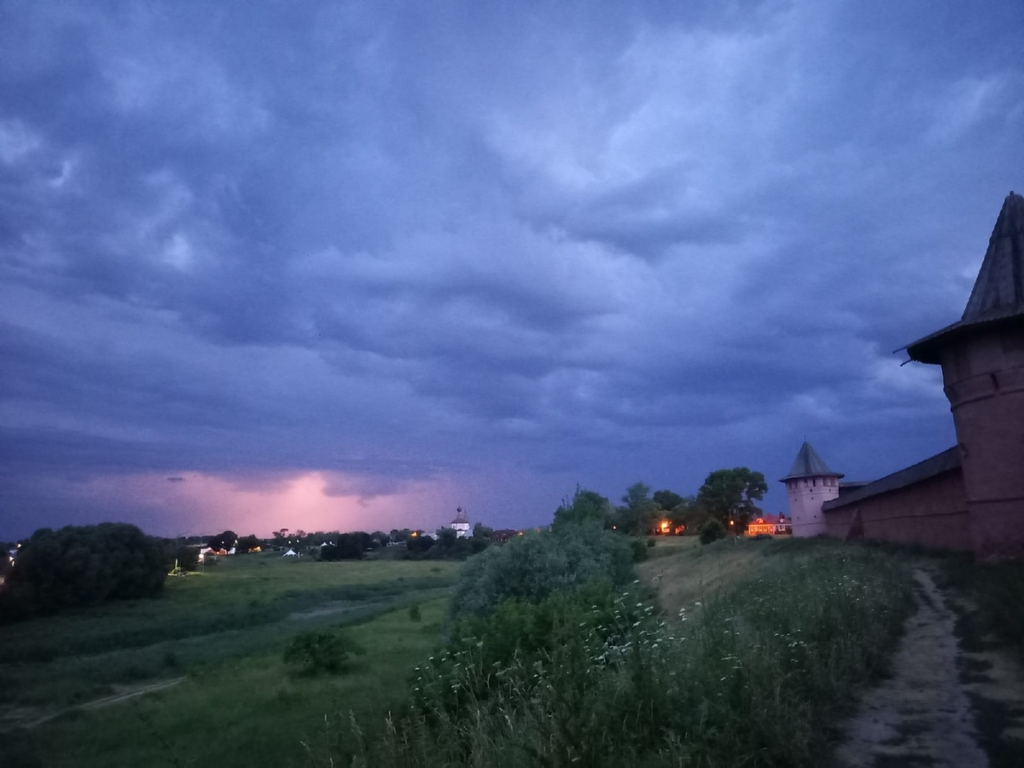 Кто меня знает – я просто до дрожи обожаю грозы. И тут я дорвалась! Мимо Суздаля проходил грозовой фронт, буквально рядом, даже не задевая. Мы побежали на эту ближайшую смотровую, и я визжала от восторга, сколько великолепных молний увидела! При всем при этом в качестве звукового сопровождения нас ожидали только сверчки да лягушки – грома слышно не было. Воробьиная ночь! Потрясающий приём от Суздаля!