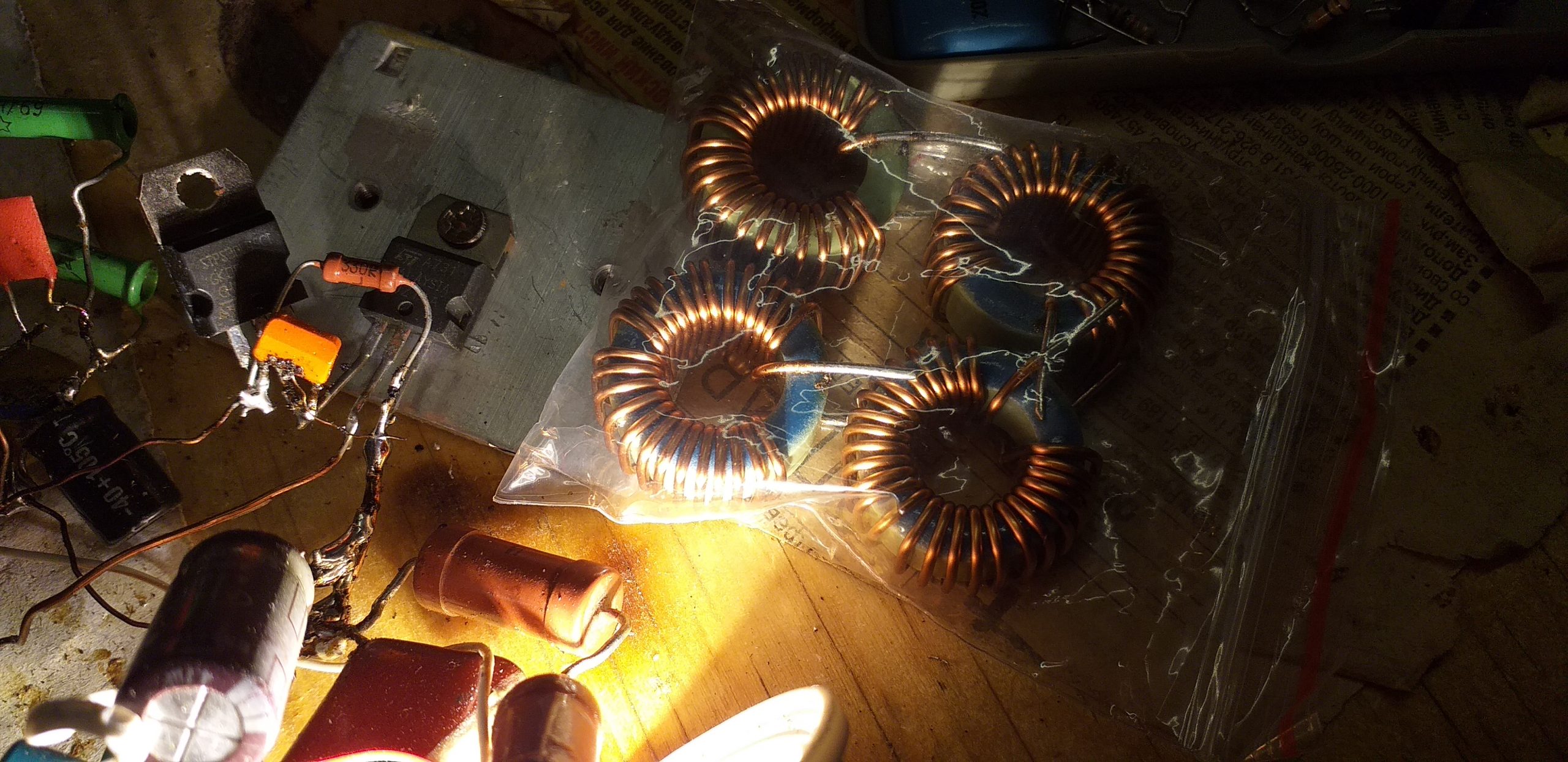 36, 38 и 75 мкГ не заработали – транзистор сильно греется (с полевиком работает но от 7 вольт) и сильная помеха на 2 мгц. (еще бы – с большой емкостью по питанию 3300 мкф и транзистор с хорошим охлаждением запустится – там импульсный ток 15 ампер оказался). на 3 вольта полевик однозначно и поднять напряжение при запуске.