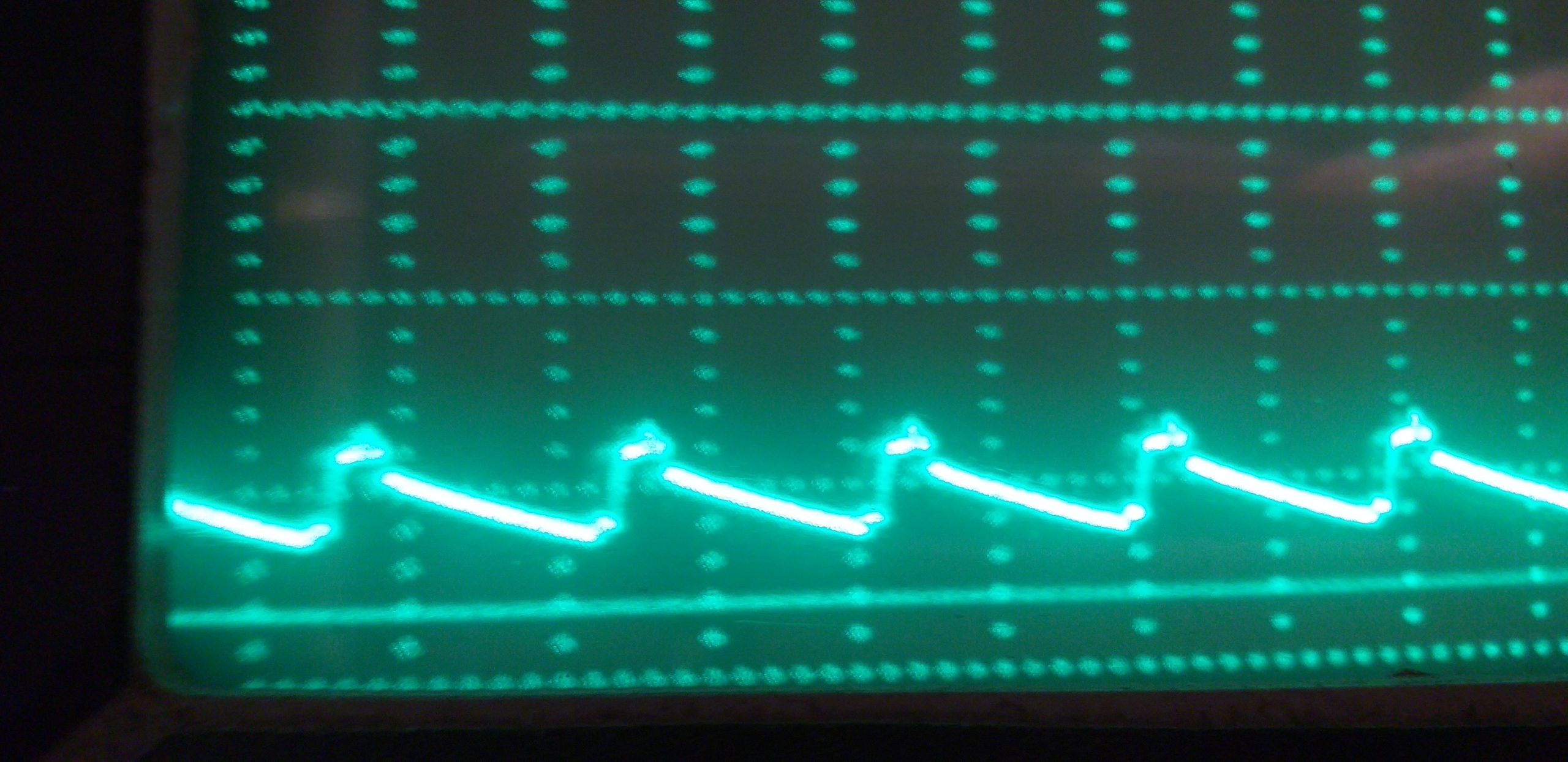 ток через не подходящее кольцо из феррита без зазора – насыщение магнитопровода (1 вольт на деление – получается 140 ампер в импульсе * 60 а не 15 и не 4 – 5 как надо) Проволока стальная в миллиметр толщиной нагрелась до 100 градусов. и сильная помеха по питанию и сигналу регулировки, а с виду не понятно – все работает, горит ярко, только ток от источника больше 4 ампер вместо 2. Полевик на 60 ампер горячий.
