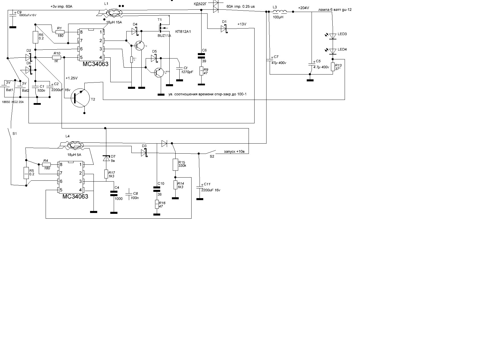 Все таки полевик – только вольтодобавка нужна. (Питание от литиевой 3.7 – 4вольта 2 ампера а не 7 вольт 2 ампера – вот такая экономия.) А полевик запускается от 6 вольт нормально. 1 вывод коллектор внутреннего транзистора отсоединить от катушки и стока полевика, а то он раньше будет пытаться раскачать катушку и скорее всего сгорит, на 1.5 ампера рассчитан а не на 6, на питание с вольтодобавкой его. 6 и 7 через 2к ,8 через резистор 180 ом и 1 напрямую на цепь вольтодобавки – от отчки соединения катушки и стока полевика еще один диод Шоттки – и после него танталовый 68 микрофарад на землю. Если схема запустилась – 6 вольт – то можно понизить входное напряжение до 3 вольт, на микросхеме и на затворе полевика 15 вольт – все холодное кроме светодиодного излучателя, от источника – 4 вольта 2.5 ампера максимально то есть 10 ватт . 50 процентов эффективность но только один элемент питания (с биполярным – тоже от 4 вольт работает НО вполнакала , не хватает яркости в 2 раза, при той же катушке на выходе еле еле 12.6 вольт, потери и сопротивление канала у полевика меньше). Запуск придется городить – чтобы запитать микросхему от 3 вольт подав на нее ( через диодик на кондер ) 6 -7 вольт.. Катушка 40 микрогенри 0.8 мм 9 витков на броневом сердечнике внешний диаметр 30мм примерно, собран с зазором 0.2 – листик бумаги (от сломаного адаптера ноутбука). Если катушечка 530 миллигенри самодельная – то для такого режима перемотать в 2 провода – импульсный ток 5 ампер и сильно проводок 0.6 греется . Для запуска схемы при 3 вольтах применяется биполярный транзистор в параллель полевику с резистором в базе 100 ом и на землю от базы 1к и кнопка, прямо от вывода 2 по черной схеме на резистор . Запуск долго не нажимать – при работе в параллель ключевого транзистора с полевиком фронт импульса совсем пологий – один транзистор не в ключевом режиме а второй не может открыться , ток от 5 вольт возрастает до 3 ампер . С емкостью 620 запускается от 3 вольт с катушкой 43 а с емкостью 1500 только с катушкой 490 .Режим работы лучше если индуктивность малая и толстый провод, емкость по 3 выводу 620, 1000 отсоединена. Если катушка большой индуктивности то легче запускается при низком напряжении, но надо в 2 провода намотать. По осциллограмме 6 – ток катушки а точнее напряжение на шунте из железной проволочки 0.1 ома доходит до 6 ампер (0.6 вольт). Вторичная обмотка не нужна. * Взял трансформатор от вспышки по схеме В Шимански, вторичная обмотка заизолирована, н а ней почти 800 вольт прямо катушка Теслы, первичная там 1 мм 6 витков 37 микрогенри, сердечник на феррите с зазором 0.2 , ток в первичной импульсный 7 ампер ай квадрат эл пополам – энергия в катушке порядочная, такой транс нужен только при работе от 3 вольтового аккумулятора. Емкость по 3 лапе 620.Катушка выравнивающая от АТХ работает так же – 57 uH используя обмотку на 12 вольт 0.8 мм в 2 провода от 500 – ваттника – не нагреется. КПД конечно – 18650 1 штука минут на 50, ток больше часового разряда что плоховато. Свинцовый на 6 вольт или в параллель несколько литиевых – опять к тому же вернулся – надо 2 .. 3 аккумулятора. При 7 вольтах ток 1 ампер, КПД 75 процентов. Если питание больше 7 вольт то обязательно снаббер – там при отключении полевика после импульса идет такая красивая гармоника на 1 мегагерц примерно (с броневым сердечником 43 микрогенри и проводом 0.9) что прямо катушка может разлететься на ку