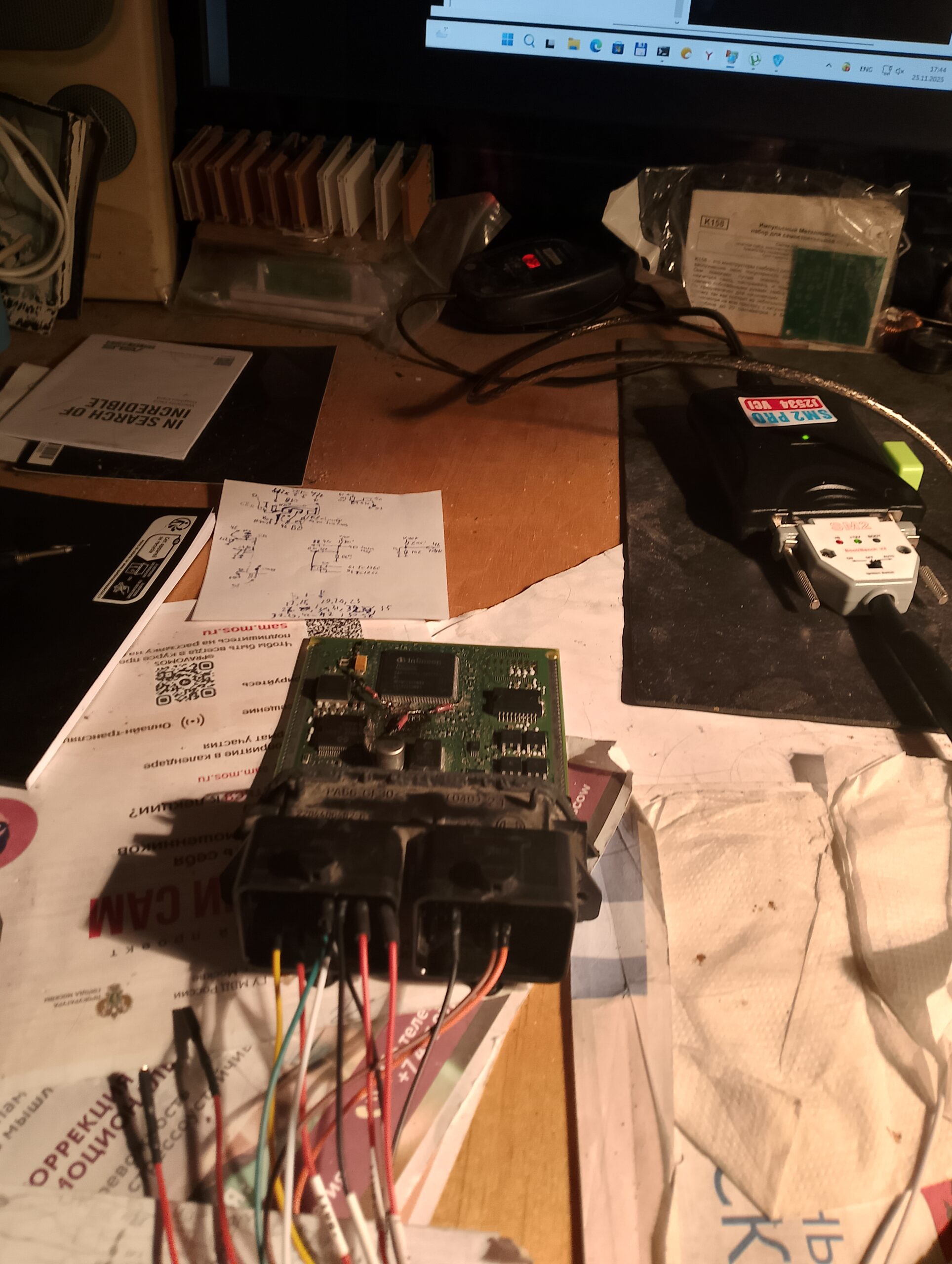 Поломки Уаз Патриот (2011) * не заводится вообще (бензин и 12 вольт есть. Какой то писк при включении с панели приборов. Лампочки и бензонасос не включаются вообще). * Заводится и едет, но только без датчика расхода воздуха (расход бензина 20л на 100 км, белый дым из выхлопной.) * Заводится, но не едет, или глохнет, или обороты 500 и меньше. на педаль газа не реагирует. (ну правильно, половина контактов земляных и питания на микроконтроллере отгорело, а он еще и работает) Ремонт - заменить Замок зажигания, блок иммобилайзера Bosch. Блок радиозамка, или носить с собой два ключа. Заменить центральный блок управления - ECU? КМПСУД с тремя новыми чип - ключами. Запчасти на почти 100 тысяч руб . и еще - может быть - все три косички проводов под капотом, только по салону - целая и менять не надо. В сумме почти 200 т. р. - как ремонт мотора или новый блок двигателя. ( Причина - чаще всего обрыв ремня и проводков к датчику, или - оплавились и замкнули к датчикам кислорода - или - вообще нагрелся до красна стартерный провод 60 квадратов - да еще еле машину потушил, залил все водой из канистры и огнетушителем.) .. Стартерный теперь от Камаза и подвязан проволокой под машиной и за мотором. Поддон он не расплавит и рулевую тягу то же, пожарку вызывать не понадобится. Он так с инженерным умом был проложен, что через года три перетерлась изоляция об острые углы кузова, да еще под косичками проводов и за мотором стеклоочистителя, там повреждения были обнаружены только после пожара, и замены всего почти под капотом. Датчики кислорода - примотаны за косичку проволокой - и к кузову, там как раз железочка, рядом с выхопным коллектором, но - подальше от него. Датчик расхода воздуха - проводки примотаны изолентой к гофре сверху, гофру ремень не перервет. Вот три поломки, еще может быть и из - за предохранителей.. Разобрал блок управления Уазика. Настолько сделан хитро, что при замыкании или обрыве почти любых проводов на датчики - выгорает напрочь, с дыркой посередине платы. И его заменить целое дело, стоимость под 600 евро, делается только в Европе. Хоть программы появились - не надо еще менять иммобилайзер и 3 ключа сразу. Пробую две платы починить - перегорает, похоже, дорожка от земляного провода и от питания, чипы на первый взгляд целы. Чип без прошивки - как раз можно купить, и который интерфейсный 40048, и и еще драйвер с управлением по spi tle8209-1r . кусочки схемы и распиновки от 40048 - драйвера управления инжекторами и компрессором кондиционера. (не нашел схему, она почему то доступна только с Украины.. выдрал из видео) кстати, схема нарисована совсем не точно, проверять! Там, где подписано 5в с процессора - часто не питание, а сигнал. Питание вроде только на 10 лапе, и то там вроде не 5 вольт - с транзистора не идет. у процессора TriCore два питания и земля конечно,Vdd Vddp Vss. https://www.youtube.com/watch?v=wp_J5K34Zr8 и фото платы, где обычно большая дырка - по номиналу трех резисторов - черных без маркировки - это обычно 4k7 а может 9к1 - подтяжка входа МК на питание или присаживание на землю. Ща померяю. 6300 Ом, или 6к3. Это только один померял, два других оторвались. Поставлю такие же, подпаяв тоненькой проволочкой от обмотки катушки. Земляной и питание - надо восстановить, как на фото. Внутренние слои платы - если повезло, то целы, а так - все 300 с чем то соединений прозванивать, это долго. * все 3 резистора на питание, 12 вольт после реле - подписано на схем
