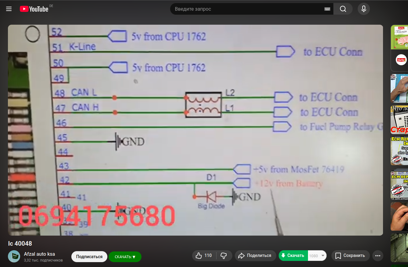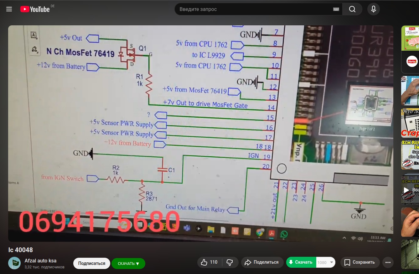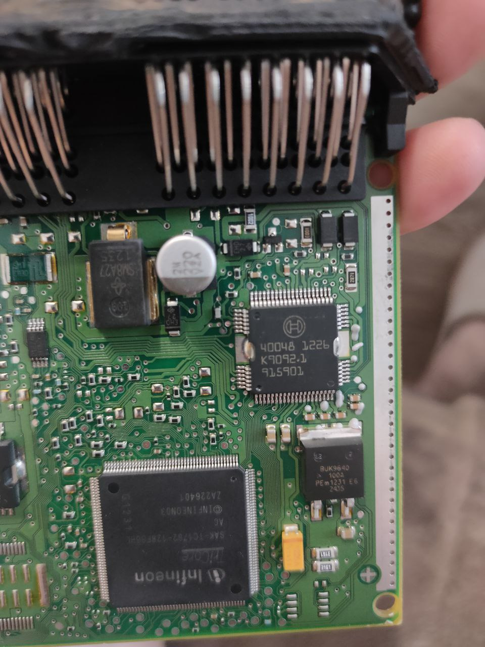 Поломки Уаз Патриот (2011) * не заводится вообще (бензин и 12 вольт есть. Какой то писк при включении с панели приборов. Лампочки и бензонасос не включаются вообще). * Заводится и едет, но только без датчика расхода воздуха (расход бензина 20л на 100 км, белый дым из выхлопной.) * Заводится, но не едет, или глохнет, или обороты 500 и меньше. на педаль газа не реагирует. (ну правильно, половина контактов земляных и питания на микроконтроллере отгорело, а он еще и работает) Ремонт - заменить Замок зажигания, блок иммобилайзера Bosch. Блок радиозамка, или носить с собой два ключа. Заменить центральный блок управления - ECU? ЭБУ с тремя новыми чип - ключами. Запчасти на почти 100 тысяч руб . и еще - может быть - все три косички проводов под капотом, только по салону - целая и менять не надо. В сумме почти 200 т. р. - как ремонт мотора или новый блок двигателя. ( Причина - чаще всего обрыв ремня и проводков к датчику, или - оплавились и замкнули к датчикам кислорода - или - вообще нагрелся до красна стартерный провод 60 квадратов - да еще еле машину потушил, залил все водой из канистры и огнетушителем.) .. Стартерный теперь от Камаза и подвязан проволокой под машиной и за мотором. Поддон он не расплавит и рулевую тягу то же, пожарку вызывать не понадобится. Датчики кислорода - примотаны за косичку проволокой - и к кузову, там как раз железочка, рядом с выхопным коллектором, но - подальше от него. Датчик расхода воздуха - проводки примотаны изолентой к гофре сверху, гофру ремень не перервет. Вот три поломки, еще может быть и из - за предохранителей.. Разобрал блок управления Уазика. Настолько сделан хитро, что при замыкании или обрыве почти любых проводов на датчики - выгорает напрочь, с дыркой посередине платы. И его заменить целое дело, стоимость под 600 евро, делается только в Европе. Хоть программы появились - не надо еще менять иммобилайзер и 3 ключа сразу. Пробую две платы починить - перегорает, похоже, дорожка от земляного провода и от питания, чипы на первый взгляд целы. Чип без прошивки - как раз можно купить, и который интерфейсный 40048, и и еще драйвер с управлением по spi tle8209-1r . кусочки схемы и распиновки от 40048 - драйвера управления инжекторами и компрессором кондиционера. (не нашел схему, она почему то доступна только с Украины.. выдрал из видео) кстати, схема нарисована совсем не точно, проверять! Там, где подписано 5в с процессора - часто не питание, а сигнал. Питание вроде только на 10 лапе, и то там вроде не 5 вольт - с транзистора не идет. у процессора TriCore два питания и земля конечно,Vdd Vddp Vss. https://www.youtube.com/watch?v=wp_J5K34Zr8 и фото платы, где обычно большая дырка - по номиналу трех резисторов - черных без маркировки - это обычно 4k7 а может 9к1 - подтяжка входа МК на питание или присаживание на землю. Ща померяю. 6300 Ом, или 6к3. Это только один померял, два других оторвались. Поставлю такие же, подпаяв тоненькой проволочкой от обмотки катушки. Земляной и питание - надо восстановить, как на фото. Внутренние слои платы - если повезло, то целы, а так - все 300 с чем то соединений прозванивать, это долго. * все 3 резистора на питание, 12 вольт после реле - подписано на схеме, и на сигналы процессора. резисторы. на снимке у двух почти квадратных контактных площадок.. сверху чуть левее от центра три не подписаных резистора - по 6400 Ом. То есть, померял один, два других потерялись - это снимок исправной и новой платы. Верхние две 